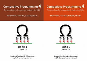 This is the companion web site for a book: "Competitive Programming 4: The Lower Bound of Programming Contests in the 2020s" (click here for details) and its three past editions written by myself (Steven Halim - UVa status, Kattis status, and also Clist open kattis status), my younger brother (Felix Halim - UVa status, Kattis status), and my friend (Suhendry Effendy - UVa status, Kattis status) in 2010 - present. This book is used in my course in School of Computing, National University of Singapore: CS3233 - Competitive Programming (2009-present) and available for wider audiences since 2010. This book contains a collection of competitive programming skills gained by solving more than 3900+ UVa (1999-present) plus Kattis (2015-present) online judge problems and being involved in the ICPCs (since 2001) and the IOIs (since 2009) in various roles: contestants (long ago), coaches/team leaders, judges/scientific committee members, ICPC Regional and Championship Contest Director (2015, 2018, 2025), and/or IOI International Committee member (2020-2021).